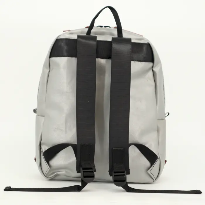 Deze grijze UPSO-rugzak is het toonbeeld van balans: compact, maar ruim, stijlvol maar ook stoer. Ideaal voor dagelijks gebruik, van woon-werkverkeer tot stedentrips. Gemaakt van gerecycled vrachtwagenzeil is elke tas uniek, met subtiele sporen van zijn vorige leven.