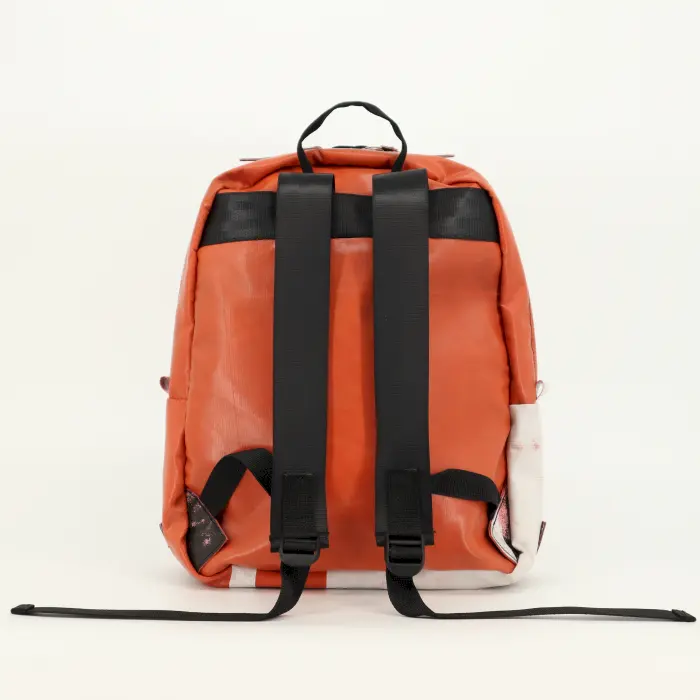 Deze witte UPSO-rugzak met oranje accenten straalt energie en eenvoud uit. Gemaakt van gerecycled vrachtwagenzeil combineert hij functionaliteit met een frisse, moderne look. Perfect voor wie houdt van een lichte, cleane stijl zonder in te leveren op robuustheid. Binnenin biedt hij plek voor een 15 inch laptop en al je dagelijkse essentials. De stevige ritssluiting, comfortabele schouderbanden en versterkte brandslangbodem maken hem klaar voor dagelijks gebruik, van fietsritten tot vliegreizen. Een tas die laat zien dat duurzaamheid en stijl perfect samengaan.