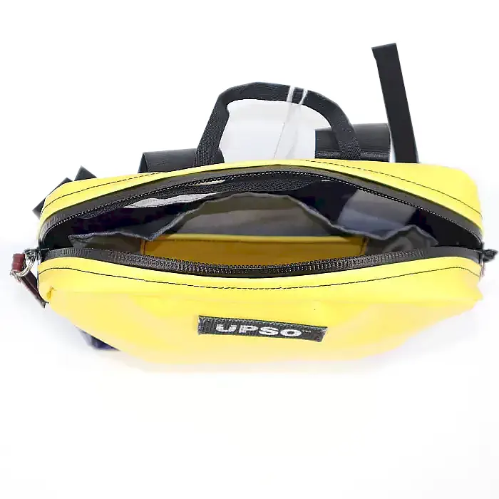 Deze gele rugzak met blauwe details is compact, comfortabel en verrassend ruim voor zijn formaat. Ideaal voor stadsritten, werk of korte uitstapjes. Dankzij de slanke vorm en brede veiligheidsgordelbanden blijft hij comfortabel, terwijl een intern vak en steekvak je spullen netjes georganiseerd houden. Waterbestendige ritssluiting en beschermende bodem van gerecycled brandslangmateriaal zorgen dat alles veilig en droog blijft.